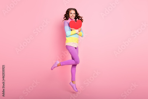 Full body photo of young lady hug paper heart present cupid jump isolated over pastel color background