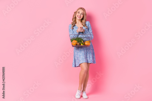 Full body photo of young lady summer blue dress eco friendly shopper basket with fruits look buy list novelty isolated on pink background