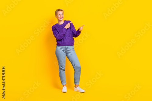 Full body portrait of charming cheerful lady look direct fingers empty space isolated on yellow color background