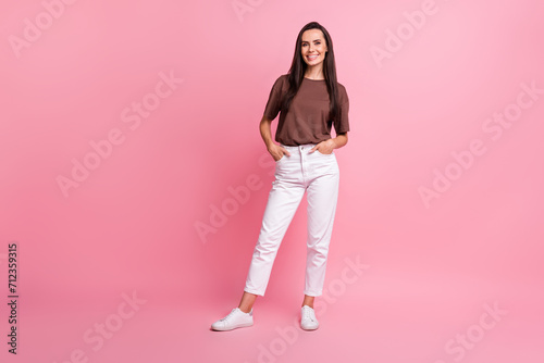 Full body portrait of gorgeous cheerful lady put hands pockets posing empty space isolated on pink color background