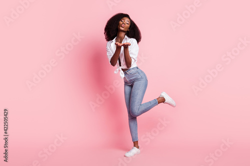 Full body portrait of pretty dark skin girl arms palms send air kiss camera you isolated on pink color background