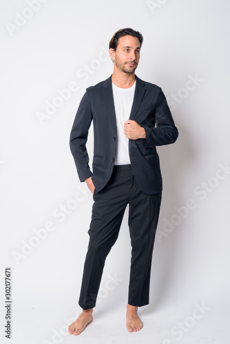 businessman, business, suit, people, portrait, hispanic, man, photogenic, caucasian, spanish, latin, 30s, male, man, guy, mid, adult, person, stubble field, beard, studio, shot, isolated, white, background, wavy, hair, executive, corporate, entrepreneur, full, body, thinks, thinking, looking, away