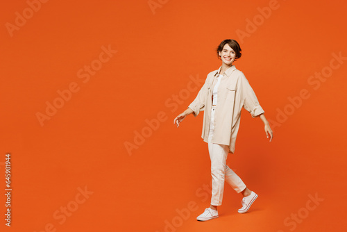 Full body side profile view young happy smiling caucasian woman she wear beige shirt casual clothes looking camera walk go isolated on plain orange red background studio portrait. Lifestyle concept.