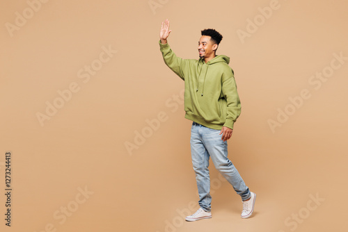 Full body side view young man of African American ethnicity he wear green hoodie casual clothes walk go waving hand isolated on plain pastel light beige background studio portrait. Lifestyle concept.