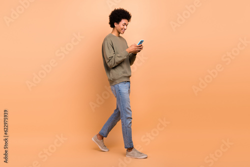 Full body size cadre of young satisfied blogger guy focused chatting smartphone online messenger vpn connection isolated on beige color background