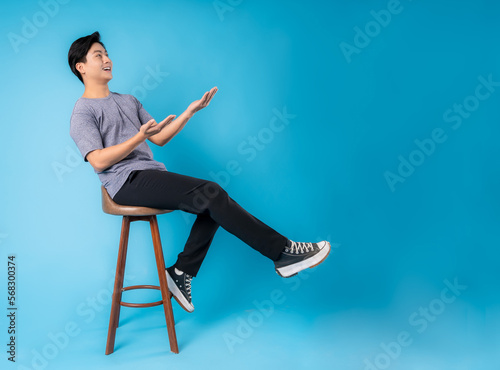 adult, asian, attractive, background, beautiful, blue, business, casual attire, chair, chinese, confident, copy, copy space, empty, fashion, finger, full body, full-length, gesture, guy, hand, photogenic, happy, indonesian, isolated, korean, malaysian, male, man, model, 1, people, person, pointing, portrait, professional, seat, showing, to sit, smile, space, studio, style, success, thai, vietnamese, young