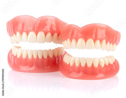 Full dentures, upper and lower, false teeth set, with pink gums and white teeth, on a white background