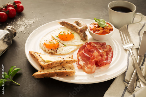 breakfast, morning, plate, white, table, food, hot drink, egg, baked beans, sausage, toast, bacon, tomatoes, kitchen, cooking, gastronomy, bar, pub, traditional, composition, layout, meal, black, menu, hotel, home, homemade, scenery, scene, touristic, pension, guesthouse, bed and breakfast, nourishment, fat, calorie