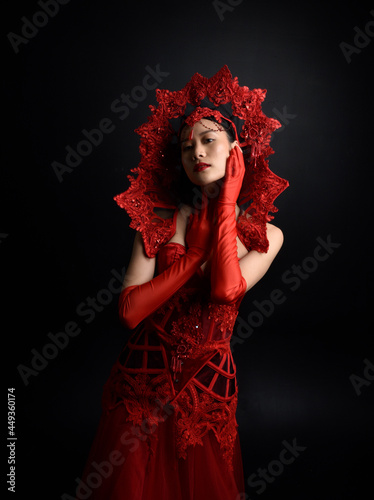 Full length portrait of beautiful young asian woman wearing red corset, long opera gloves and ornate gothic queen crown. Graceful posing isolated on a dark studio background.