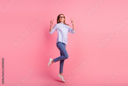 Full length body size photo of girl showing two hands v signs jumping high up isolated pink background