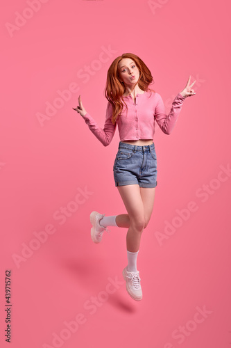 Full length body size photo of redhead woman jumping showing v-sign isolated on vivid pink color background, studio portrait. Young female in pink shirt and denim jeans looking happy