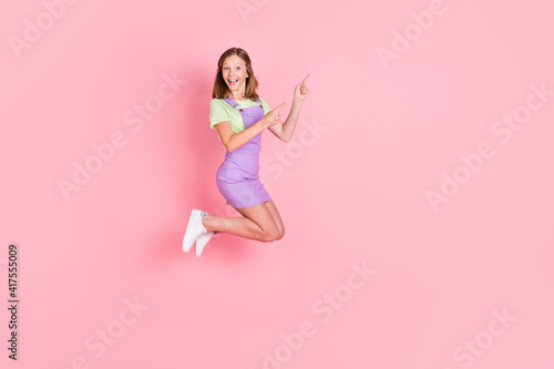 Full length body size photo of small girl jumping high showing fingers copyspace smiling isolated pastel pink color background
