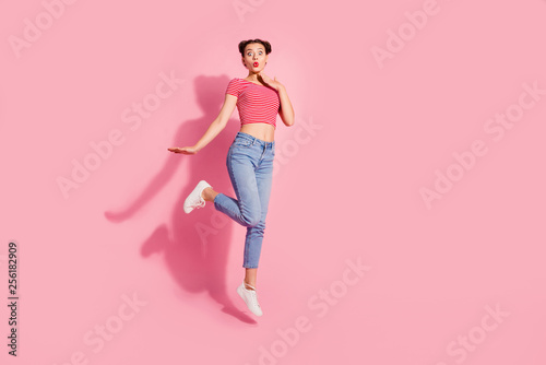 Full length body size photo yelling beautiful she her lady bright pomade lips jump high unbelievable breaking news wear casual jeans denim striped red white t-shirt sit floor isolated pink background