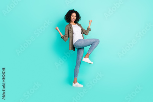Full length body size view of attractive cheerful thin girl rejoicing having fun isolated over bright blue color background