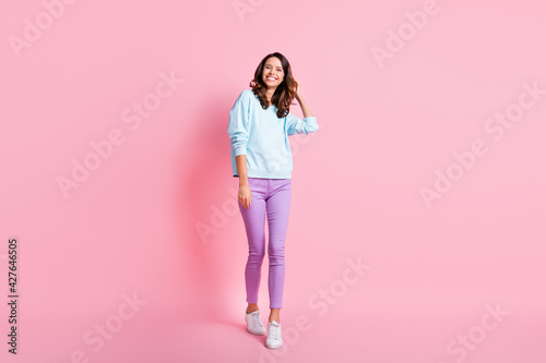 Full length body size view of pretty cheerful glad skinny wavy-haired girl walking having fun isolated over pink pastel color background
