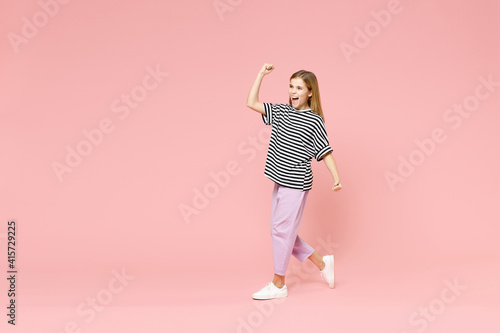 Full length little blonde excited kid girl 12-13 years old in striped oversized t-shirt do winner gesture clench fist walk isolated on pink background children portrait. Childhood lifestyle concept.