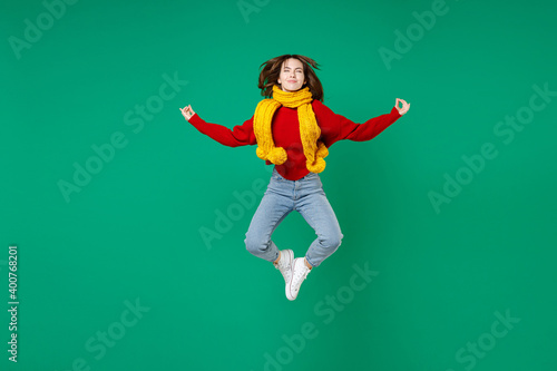 Full length of smiling cheerful young brunette woman 20s in knitted red sweater yellow scarf jumping hold hands in yoga gesture relaxing meditating isolated on green color background studio portrait.