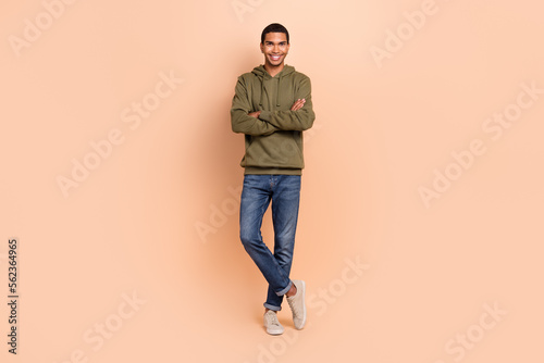 Full length photo of attractive successful man wear new collection khaki trendy clothes arm crossed isolated on beige color background