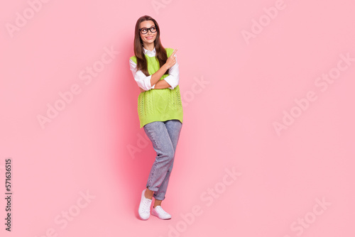 Full length photo of cheerful girl straight hairstyle dressed green vest look directing empty space isolated on pink color background