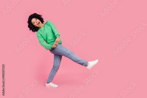 Full length photo of cheerful pretty lady dressed green pullover walking having fun empty space isolated pink color background