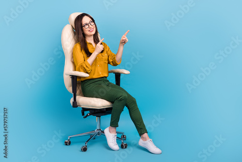Full length photo of dreamy shiny woman wear yellow shirt spectacles showing two fingers empty space isolated blue color background