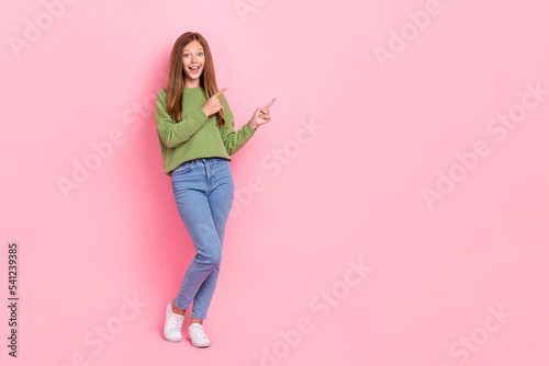 Full length photo of excited sweet schoolgirl wear green sweatshirt pointing two fingers empty space isolated pink color background