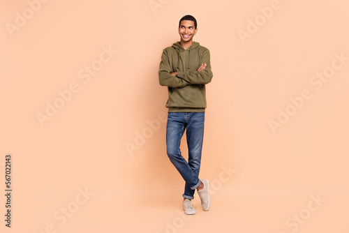 Full length photo of good looking glad man wear stylish clothes stand near empty space interesting offer isolated on beige color background