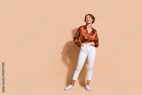 Full length photo of good mood dreamy woman wear silky blouse looking empty space isolated beige color background