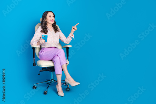 Full length photo of senior woman armchair device point look empty space dressed stylish formalwear isolated on blue color background