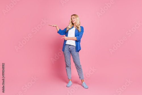 Full length photo of shiny attractive lady dressed blue jacket showing arm height empty space isolated pink color background