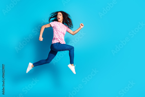 Full length photo of shiny attractive lady dressed pink t-shirt running jumping high empty space isolated blue color background