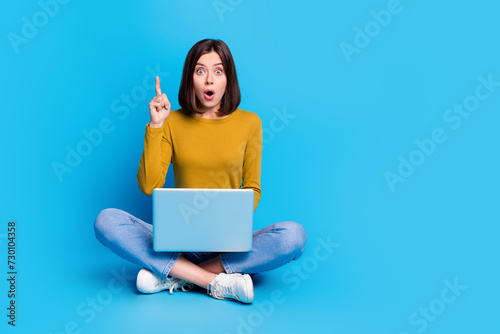 Full length photo of sweet smart lady dressed shirt chatting modern gadget pointing finger empty space isolated blue color background