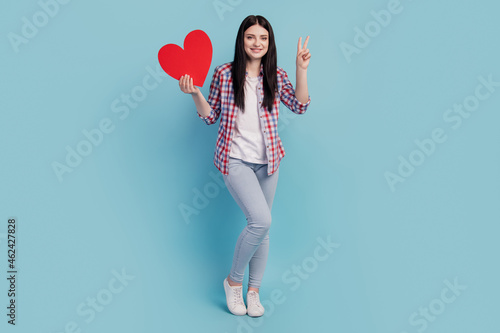 Full length photo of young cheerful girl hold heart paper love romantic show cool v-sign isolated over turquoise color background