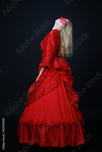 mask, masquerade, red, crimson, gown, dress, victorian, historical, fantasy, woman, lady, girl, female, silk, long, blond, dark, standing, black, background, romance, beautiful, history, beauty, young, fashion, elegance, clothing, vintage, antique, romantic, costume, old, era, elegant, vampire, gothic, corset, goth, model, princess, story, fairy tale, isolated, studio, character, civil war