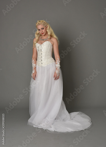 full length portrait of blonde girl wearing white corset gown. standing pose on grey studio background.