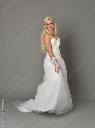 full length portrait of blonde girl wearing white corset gown. standing pose on grey studio background.