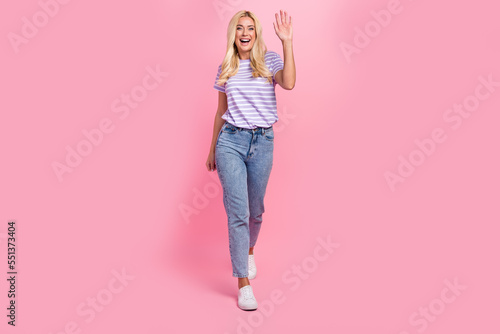 Full length portrait of cheerful lovely person toothy smile arm palm waving walking isolated on pink color background