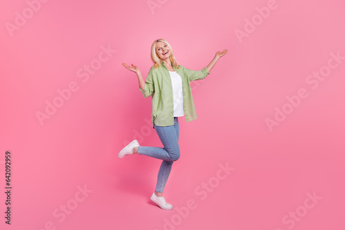 Full length portrait of lovely overjoyed lady have good mood dancing clubbing isolated on pink color background