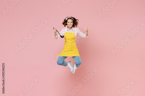 Full length portrait of smiling young woman housewife 20s in apron jumping hold soup black ladle dipper showing thumb up while doing housework isolated on pink background studio. Housekeeping concept.