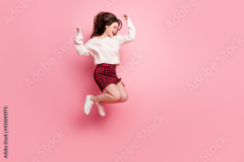 Full length profile side photo of young excited girl happy smile jump rejoice victory fists hands isolated over pink color background