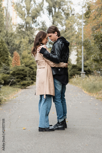 full length view of stylish young man hugging pretty girlfriend in trench coat outdoors.