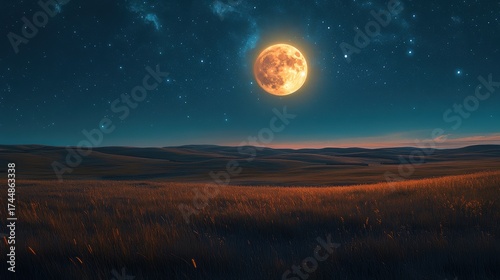 Full moon and Japanese pampas grass in midnight,The harvest Miscanthus sinensis and full moon,beautiful night sky in the countryside with the perfect moon exudes beauty in the dark.