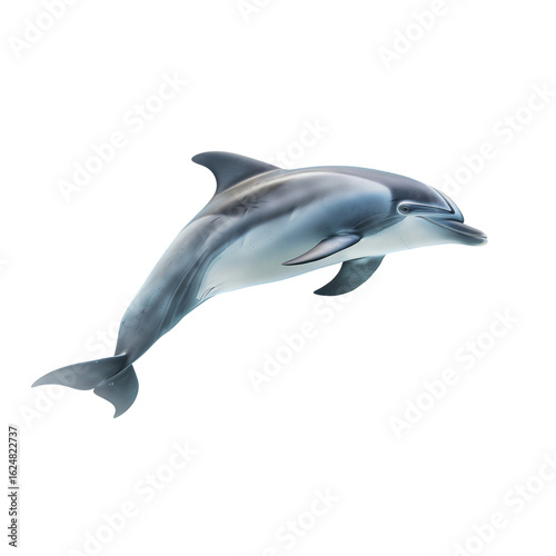 Full side profile of dolphin swimming underwater with streamlined body and gentle light reflections, clear water texture, real look, full view, on white background, 4k, unique, no blur, clear view
