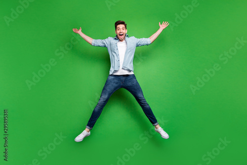 Full size photo of handsome guy jumping high in star shape celebrating sport competition first place winning wear casual denim outfit isolated green color background