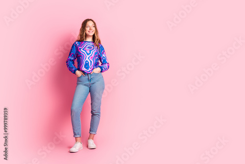 Full size photo of pretty young woman look empty space wear pullover isolated on pink color background