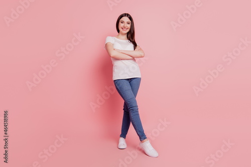 Full size photo of young cheerful girl happy positive smile confident folded hands isolated over pink color background