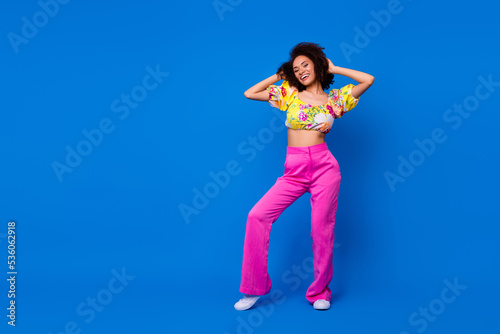 Full size portrait of stunning positive person hands touch wavy hairdo empty space isolated on blue color background