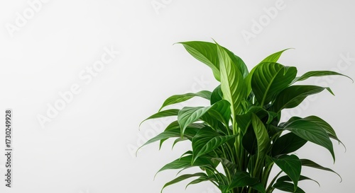 Full view of green peace lily plant with large leaves. Houseplant interior decoration for healthy living concept. Nature aesthetic.