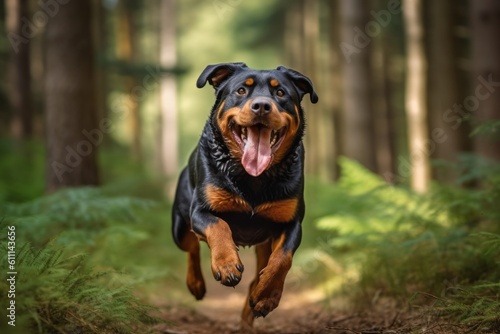 Full-length portrait photography of a smiling rottweiler running against forests and woodlands background. With generative AI technology
