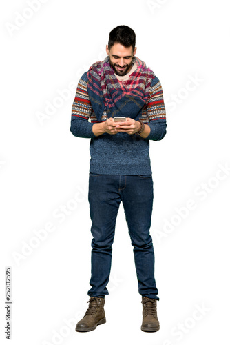 Full-length shot of Hippie man sending a message with the mobile on isolated white background